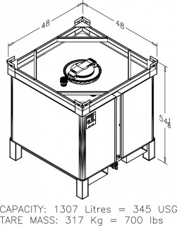 48" x 48" x 54.125", 1307 Litre / 345USG, Tare 317Kg / 700Lb