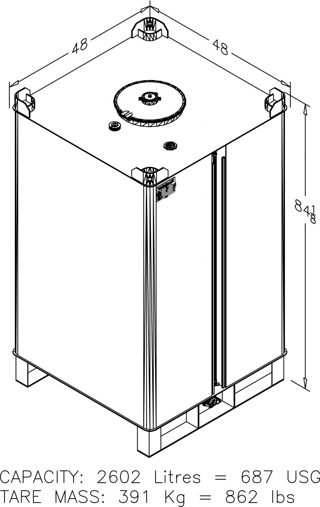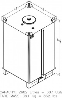 48" x 48" x 84.125", 2602 Litre / 687USG, Tare 391Kg / 862Lb